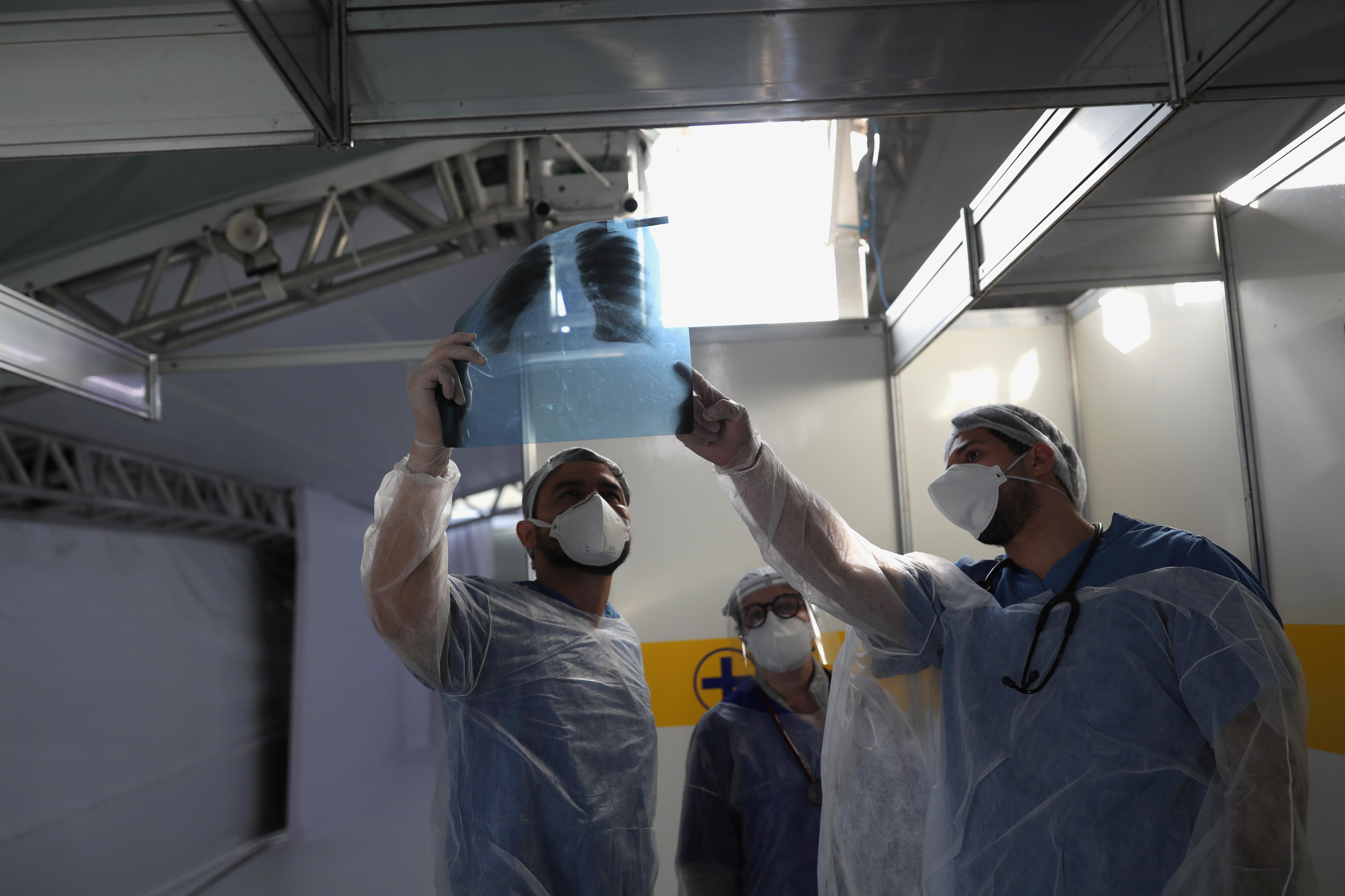 | Médicos observam exame de paciente com Covid-19 em hospital de campanha em Guarulhos (Reuters / Amanda Perobelli) |